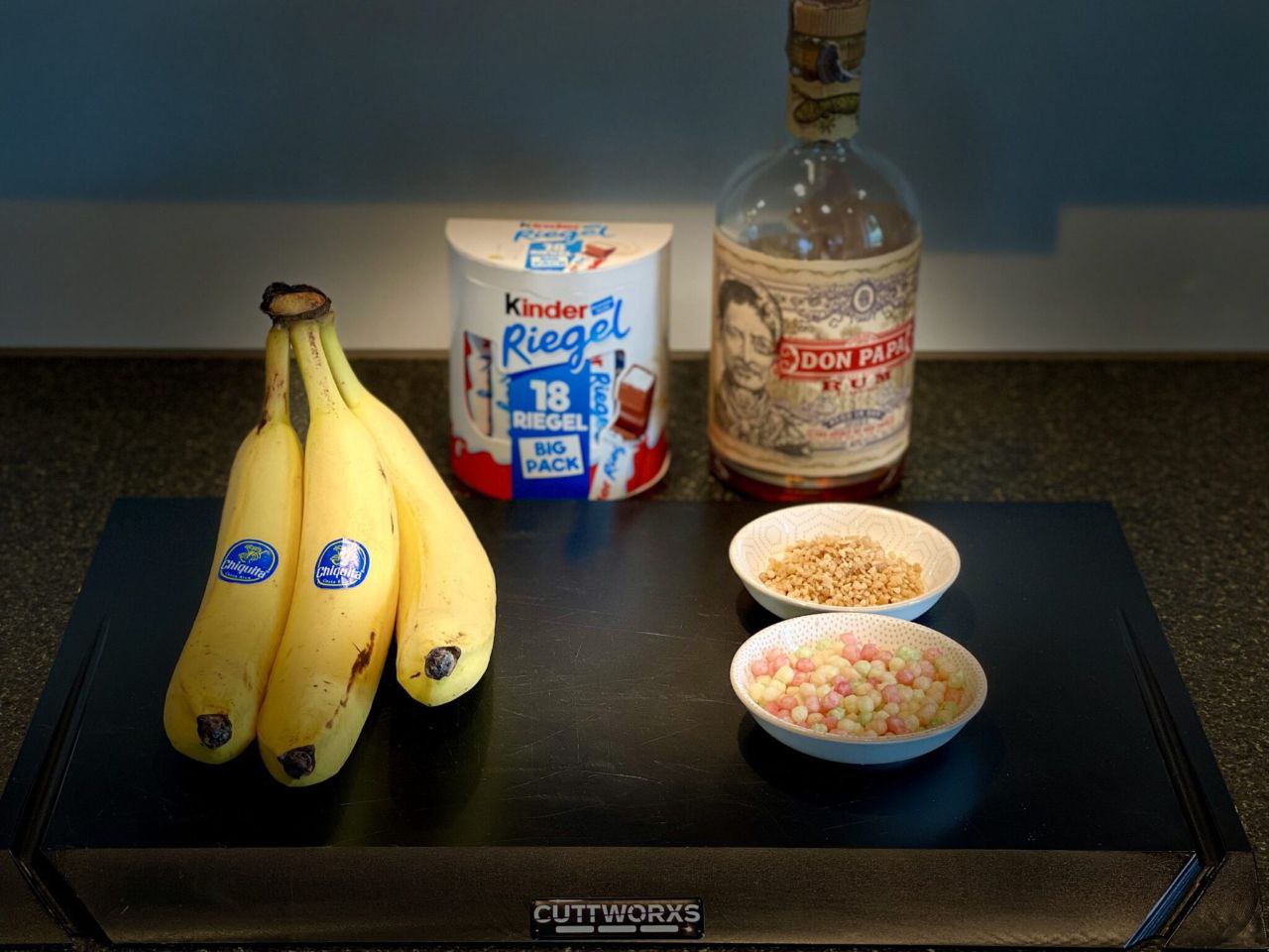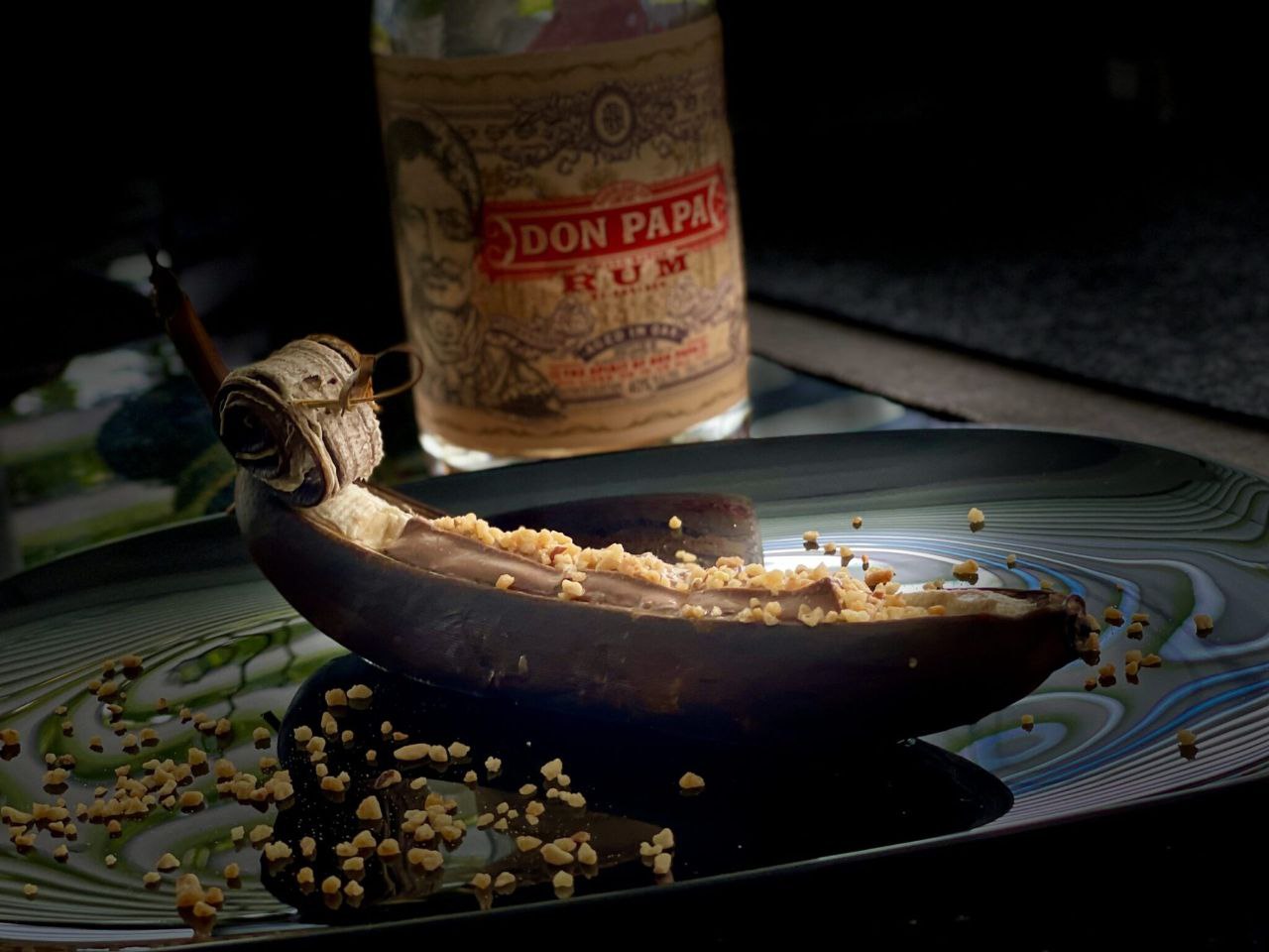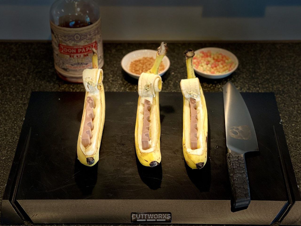 Разогрейте Monolith непрямым методом до 80 градусов. Надрежьте кожуру с нижней части банана, так, чтобы ее можно было аккуратно закрутить наверх. чтобы он аккуратно поместился на гриле (а затем и на тарелке). Закрепите ее шпажкой у хвостика банана.
