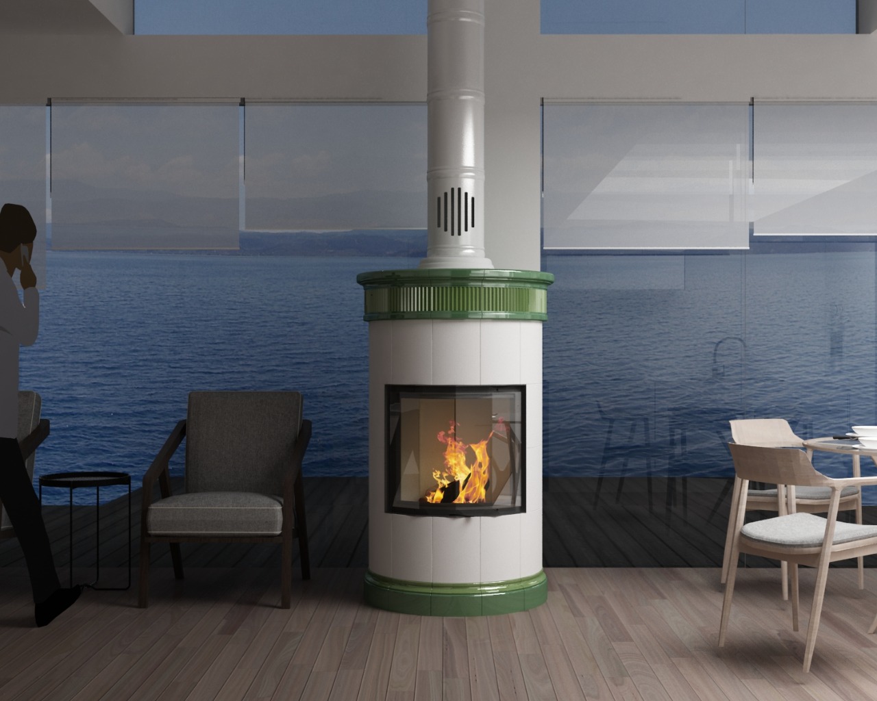 Дизайнер Дарья Белова @kimrpech разработала эту модель и изразцы для нее. Изразцовый камин будет установлен в доме на морском побережье, в большом помещении с панорамными окнами и видом на море.