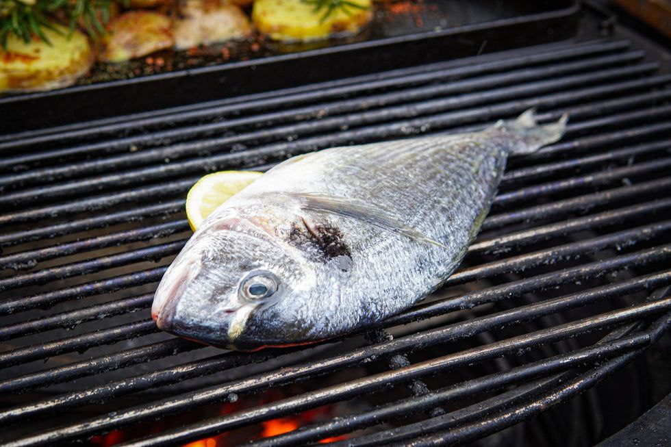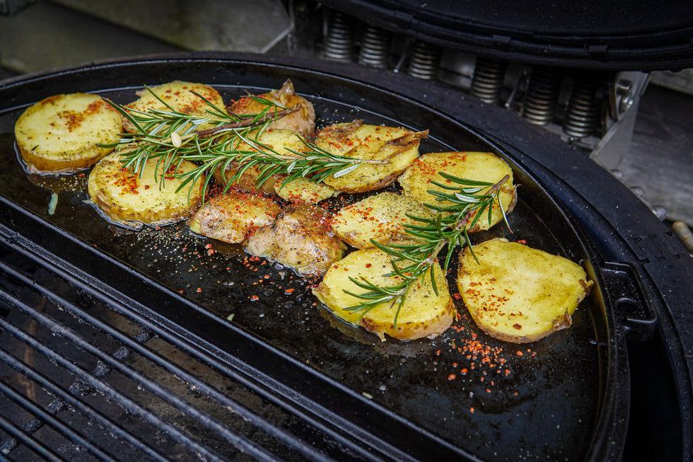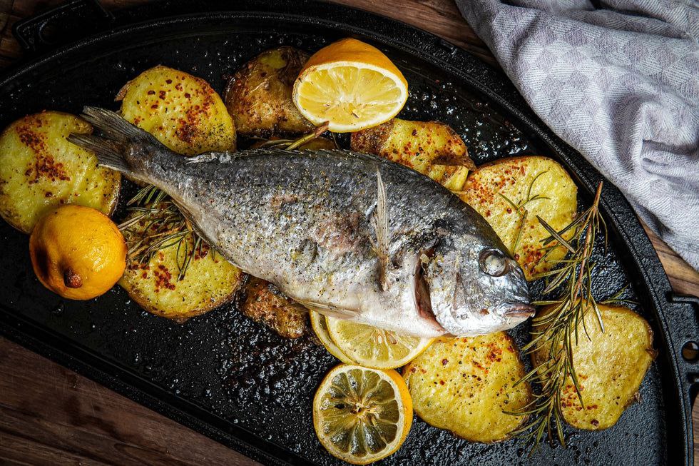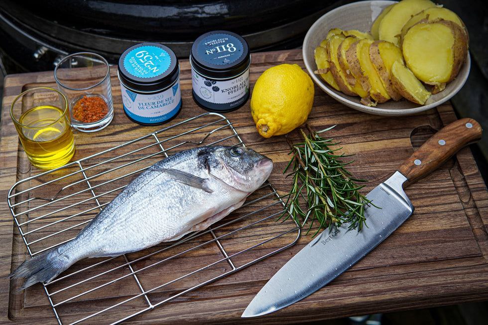 Разогрейте Monolith, готовить будем непрямым способом. Нарежьте картофель толстыми ломтиками. Как только гриль нагреется, разогрейте оливковое масло на сковороде. Обжарьте ломтики картофеля в горячем масле до золотистого цвета. Тем временем приготовьте дораду: смажьте ее оливковым маслом, обложите ломтиками лимона, посыпьте солью и перцем. Приправьте обжаренный картофель перцем, порошком чили, свежим розмарином и соком половины лимона. Аккуратно слегка обжарьте дораду на решетке с обеих сторон, затем выложите на картофель. Готовьте с закрытой крышкой при температуре около 160 градусов в течение примерно 25 минут.