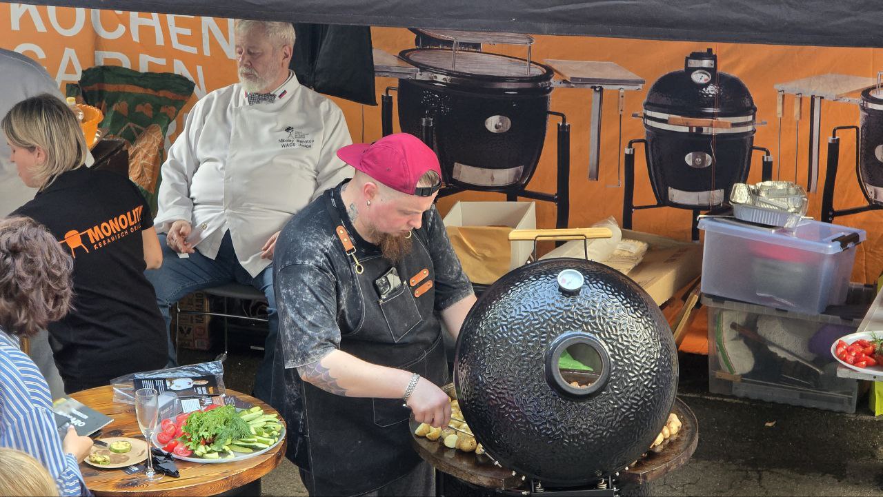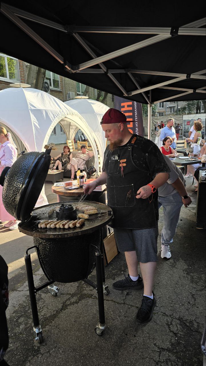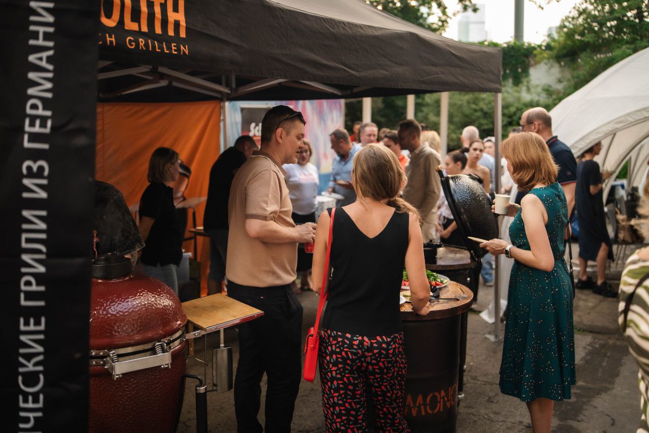 На грилях Monolith для гостей вечера запекали креветок, куриные крылышки, свинину, гамбургеры и другие блюда.